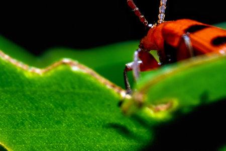 Black beetle perched on vibrant leaves, showcasing intricate details and textures. Nature and entomology concept with green background.