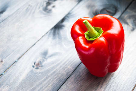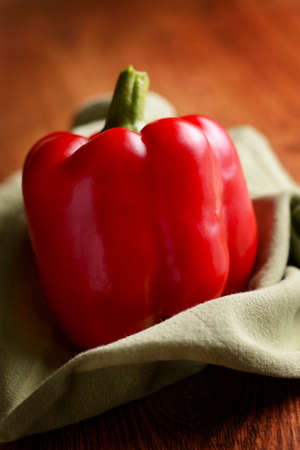 A vibrant red bell pepper sits on a wooden cutting board, showcasing its glossy texture and healthy appeal, perfect for culinary creations and healthy meals.