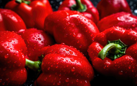 Juicy, vibrant red bell pepper coated with dew-like water droplets, highlighting freshness and crispness against a dark, sleek backdrop.
