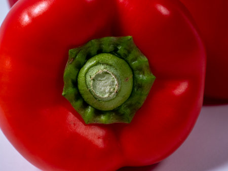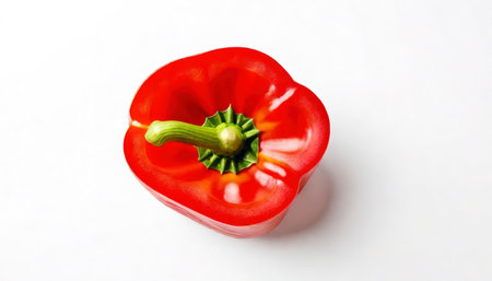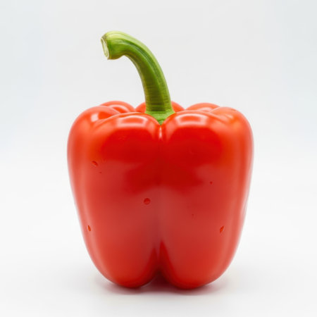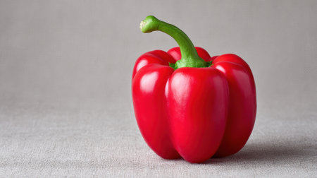 Fresh vibrant red bell pepper isolated on a neutral background, highlighting its glossy surface and natural textures. Healthy eating and vegetable concept.