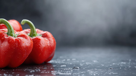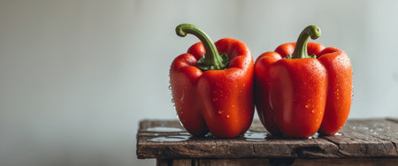 AI Generated. Two Red Bell Peppers with Water Drops on Rustic Wood