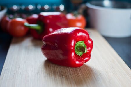 Bright Red Bell Pepper on Wooden Cutting Board, Kitchen Setting