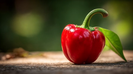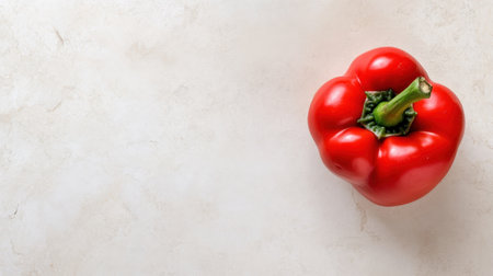 A fresh organic red bell pepper gracefully positioned on a light stone background, emphasizing healthy eating and culinary creativity for various dishes.