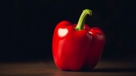A vibrant red bell pepper stands alone in a studio setting. Its smooth skin and crisp form are highlighted, showcasing it as a versatile and healthy ingredient for culinary creations.