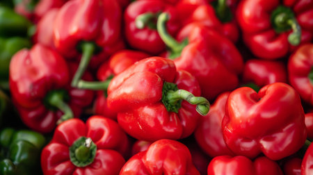Close-up of vibrant red bell peppers with fresh green stems, showing their natural texture and freshness, ideal for healthy eating concepts.