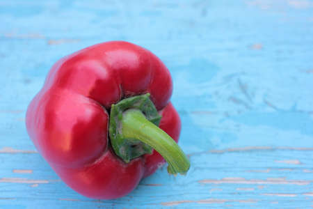 Red bell pepper on light blue wooden background. Close-up, copy space