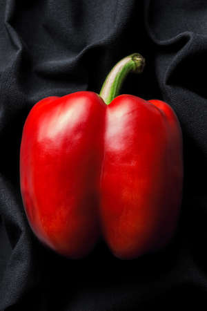 Close-up of a red bell pepper on black wrinkled fabric, top view