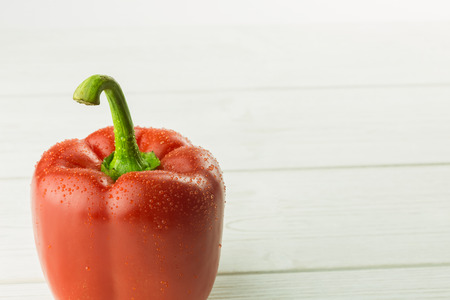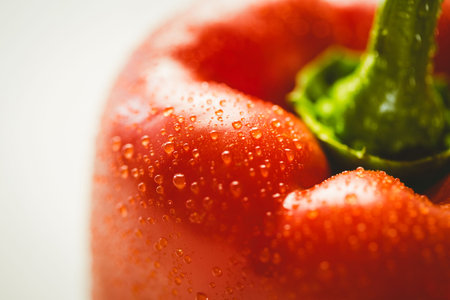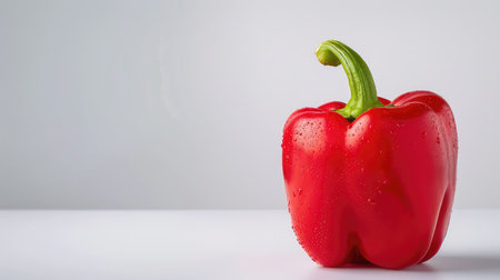 This image features a fresh red bell pepper with water droplets on a clean white surface, showcasing its vibrant color and texture, ideal for healthy cooking and nutrition themes.
