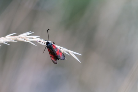 Closeup shot of a bright red Cardinal Beetle climbing a straw