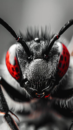This striking close-up captures a red and black beetle crawling on a textured surface, showcasing its intricate details. The vivid colors and sharp features of the beetle create a captivating image that highlights the beauty of natures small wonders.