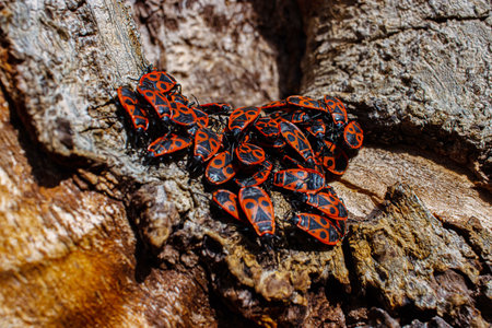 The firebug Pyrrhocoris apterus. Common insect of the family Pyrrhocoridae. Aggregation behavior of the large group of firebugs on the tree bark. Nature background. Top view. Close up. Selective focus