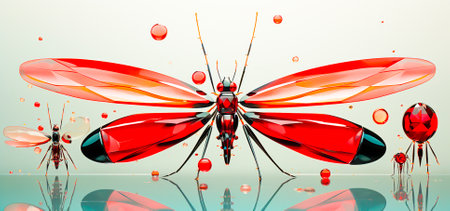 A luminous insect with striking red wings hovers against a soft, dark backdrop. Its delicate features are highlighted, capturing the essence of evening magic in nature.