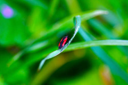 Red bug on green leaf in the nature or in the garden.