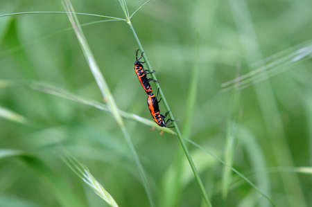 Fire bug on a blade of grass during copulation