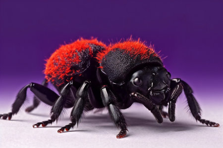 Close-up of a red ant isolated on a purple background.