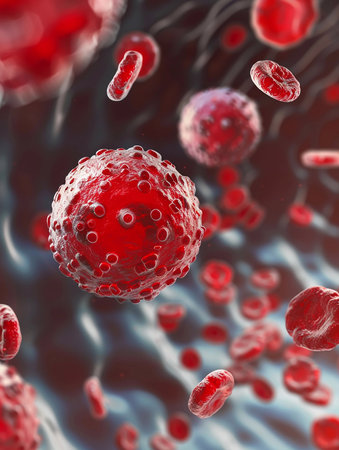 Microscopic world with a detailed 3D illustration of germs and blood cells, offering a close-up view for medical exploration and study.