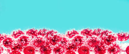 red beads in water with bubbles, Christmas card, abstraction.