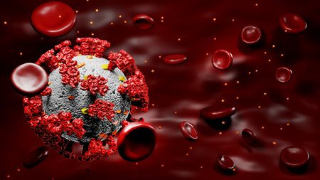 Coronavirus Covid-19 cells with human red blood cells in blood vessels human body influenza background, infectious virus. SARS, 3D render