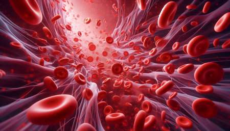 Vibrant depiction of circulating red blood cells. High-resolution erythrocytes image. Useful for educational content on blood function and cellular health. Space for text. Vertical