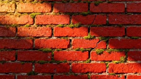 Rustic reddish-orange brick wall background showing rough texture and decaying mortar joints filled with patches of vibrant green moss, intensely highlighted by low-angle golden hour sunlight.