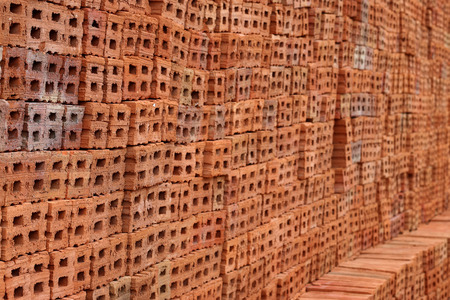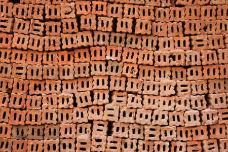 Close up pile new red brick with holes stacked in rows wall. Store of bricks ready for building or sale. Background Building Construction materials Texture, outdoor storage or manufacturing concept