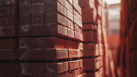 Close-up of stacked terracotta bricks, showcasing their rough texture and arranged in an orderly fashion with sunlight highlighting the bricks' surface and creating a shadow.