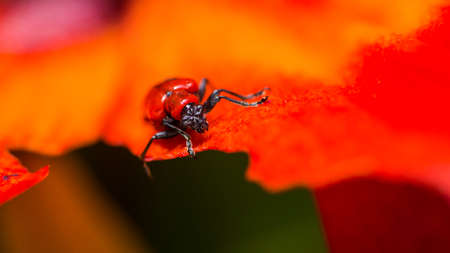 Macro shot of adult scarlet lily beetle (Lilioceris lilii) sitting on a green lily plant leaf blade in garden. Its forewings are bright scarlet and shiny. Legs, eyes, antennae and head are black