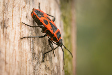Firebug, pyrrhocoris apterus beetle walking in grass. Macro animal background