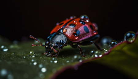 Spotted ladybug crawls on green leaf in wet summer grass generated by artificial intelligence