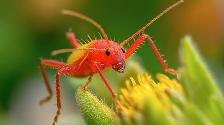 A striking red insect perches on a green flower petal, showcasing vivid colors and intricate details, capturing the beauty of nature and wildlife in a close-up view.