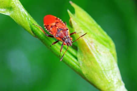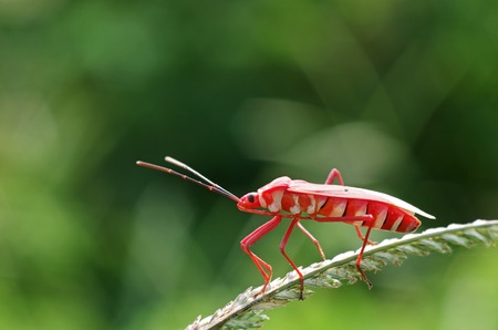 close up of the red hemipteran bug on the grass shoot
