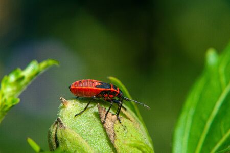 Striking Red Cotton Bug Dysdercus cingulatus on a green leaf macro shot