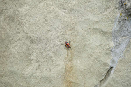 One firebug, Pyrrhocoris apterus on red granite. Selective focus. High resolution photo.