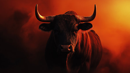 A bull with horns is standing in front of a red background. The bull is the main focus of the image, and the red background creates a dramatic and intense atmosphere