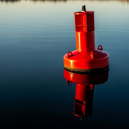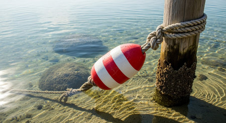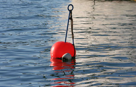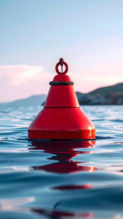 A vibrant red buoy rests peacefully on the calm blue water, creating a tranquil scene with gentle ripples and reflections, ideal for nautical-themed design or serene nature imagery.
