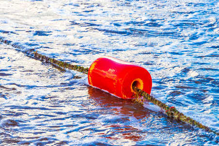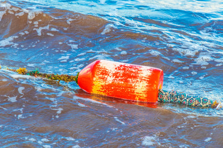 Beautiful blue and turquoise water waves ocean and yellow red orange buoy and ropes in the water of Playa del Carmen in Quintana Roo Mexico.