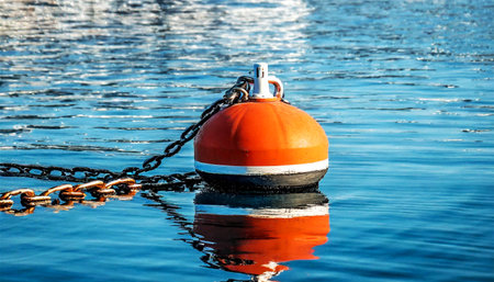 Closeup of a red and orange large buoy for mooring boats on the surface of the blue water with chains. Generative Ai.