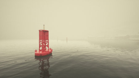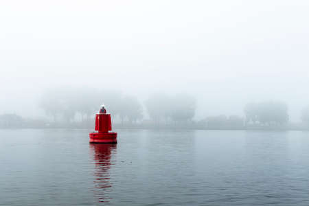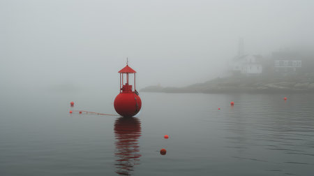 A bright red buoy stands alone in tranquil waters, surrounded by thick fog. The scene captures a peaceful morning atmosphere with muted colors and a sense of calm.