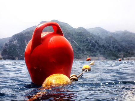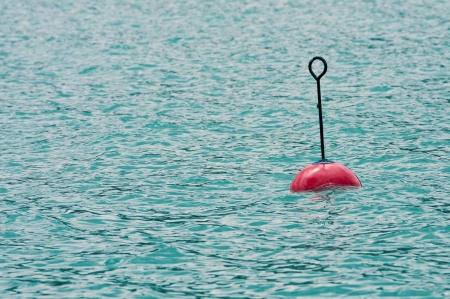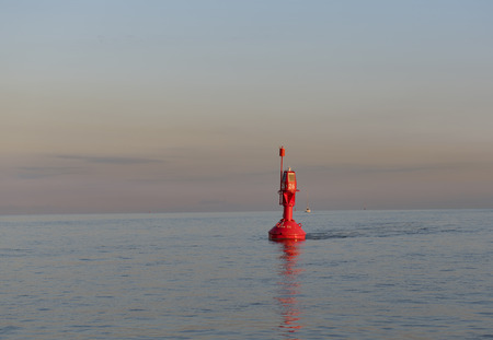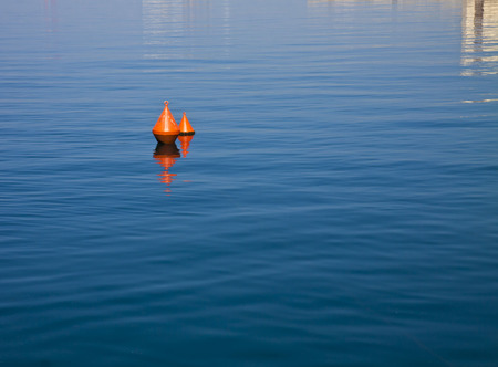 Blue seascape, idyllic shot of calm sea water and warning buoy. Marine objects concept.