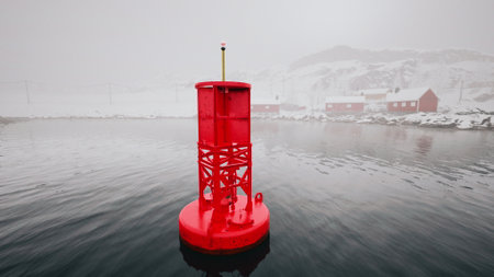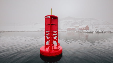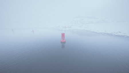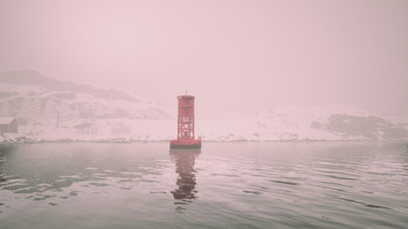 A vibrant red buoy floats in calm waters, surrounded by a foggy atmosphere. Snow covered landscapes and distant structures add an aura of tranquility to the coastal view.