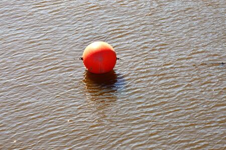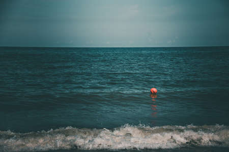 Orange buoy against the background of waves in the sea, colorful minimalism