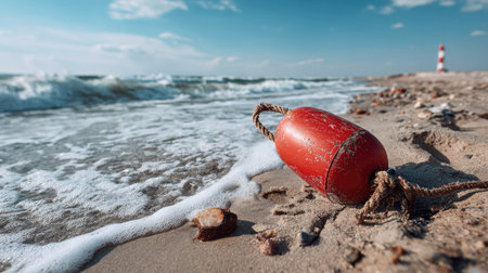 A vibrant red buoy rests on a sandy beach surrounded by gentle waves and shells. The tranquil ocean landscape features a lighthouse in the distance under a clear blue sky.