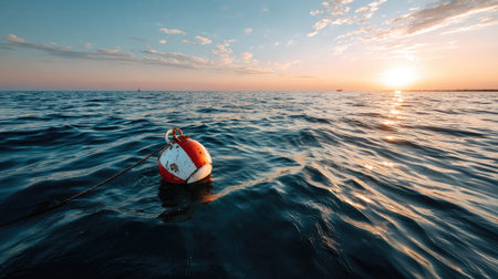 A serene image capturing a buoy floating on calm ocean waters during sunset. The horizon glows with warm colors, reflecting tranquility and natural beauty.