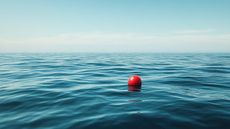A vibrant red buoy rests peacefully on the surface of calm ocean waters under a clear blue sky, capturing the essence of tranquility and the beauty of nature.