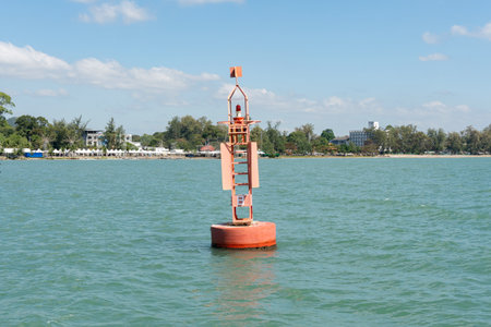 Red steel navigational floating buoy on blue sea,gulf of Thailand.