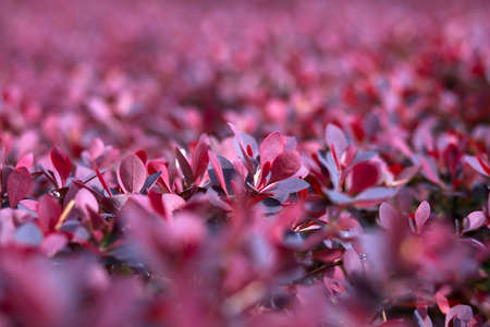 Purple Leaves On Bush Of Thunberg's Barberry, Berberis Thunbergii, The Japanese Barberry, Or Red Barberry illuminated by soft evening sunlight, autumn background.