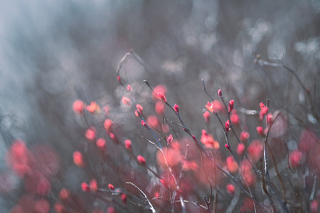 Mess of blurred and focus berberis thunbergii branches with dark red leaves. Atmospheric ruby color autumn background with blur place for text