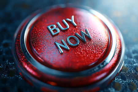 Close-up of red glossy Buy Now push button on dark surface. E-commerce urgency, digital retail promotion, sales event. Black Friday, Cyber Monday, seasonal sales. Online business marketing concept.
