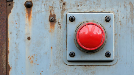 A close-up view of a bright red button mounted on a weathered metal surface. The contrasting colors and textures create an industrial feel, perfect for designs related to machinery or safety themes.