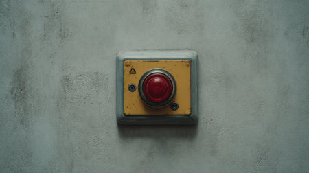 A vivid red emergency button mounted on a textured wall in a contemporary office setting, representing immediate action and safety in critical situations.